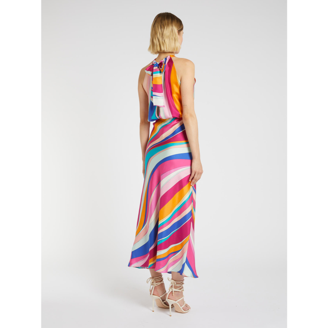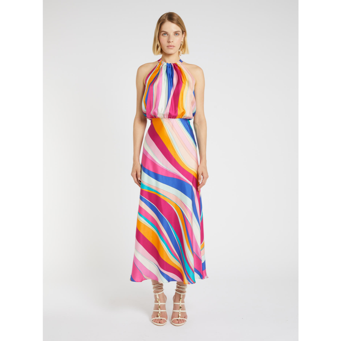 Dedicato alle occasioni mondane, l’abito in seta lascia scoperte le spalle e la schiena, giocando con fluidità e drappeggi. Completa il mix cromatico della stampa con sandali svettanti e orecchini bijoux.