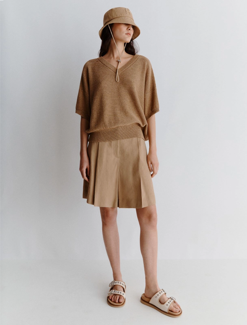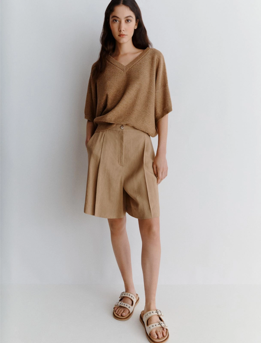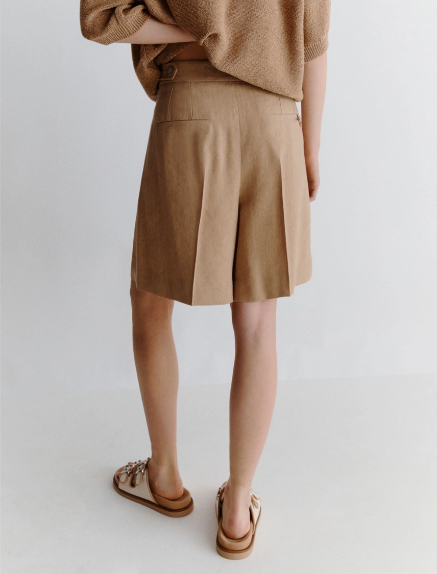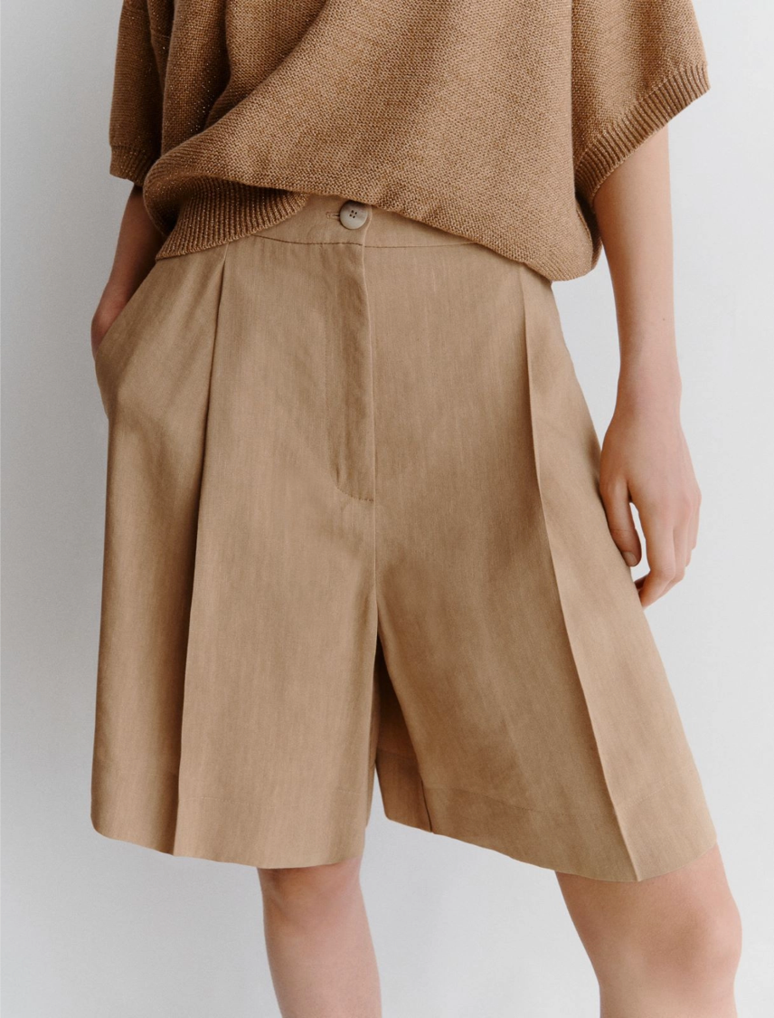 Evoluzione sofisticata del bermuda, con lino in trama e un gioco di alamari sui fianchi. Per city look estivi dall’eleganza timeless.