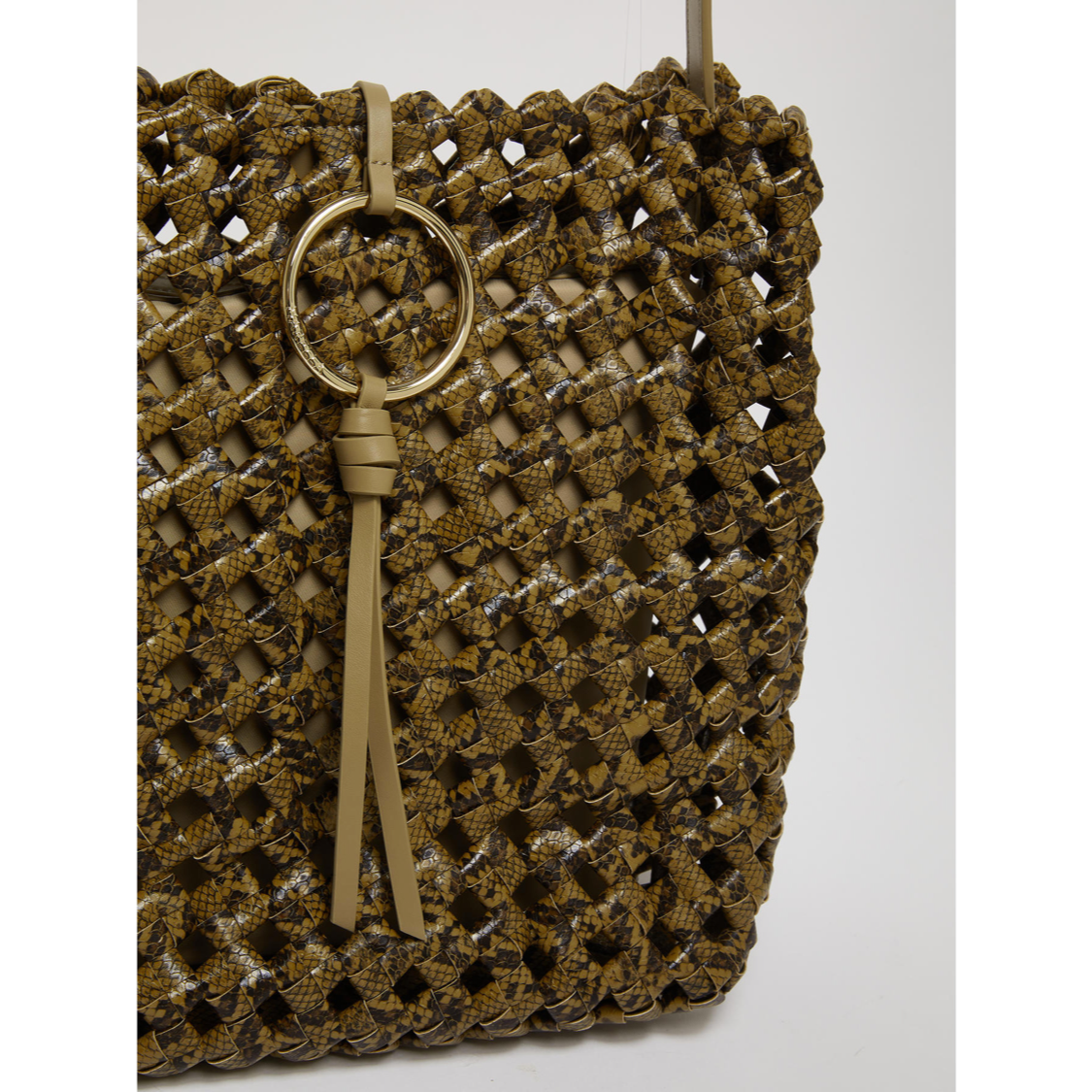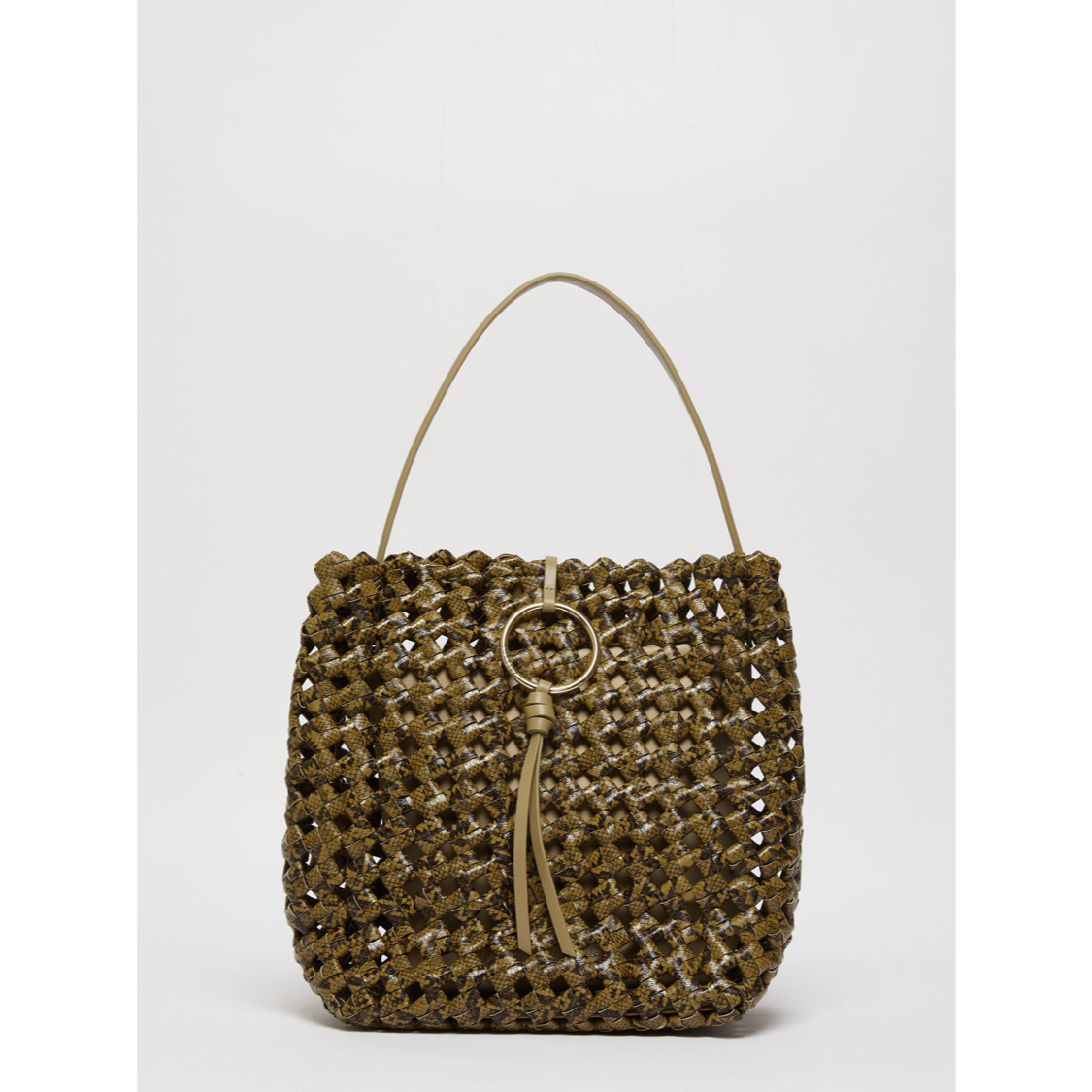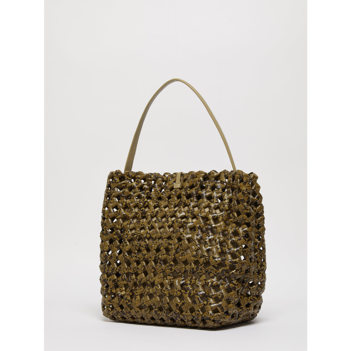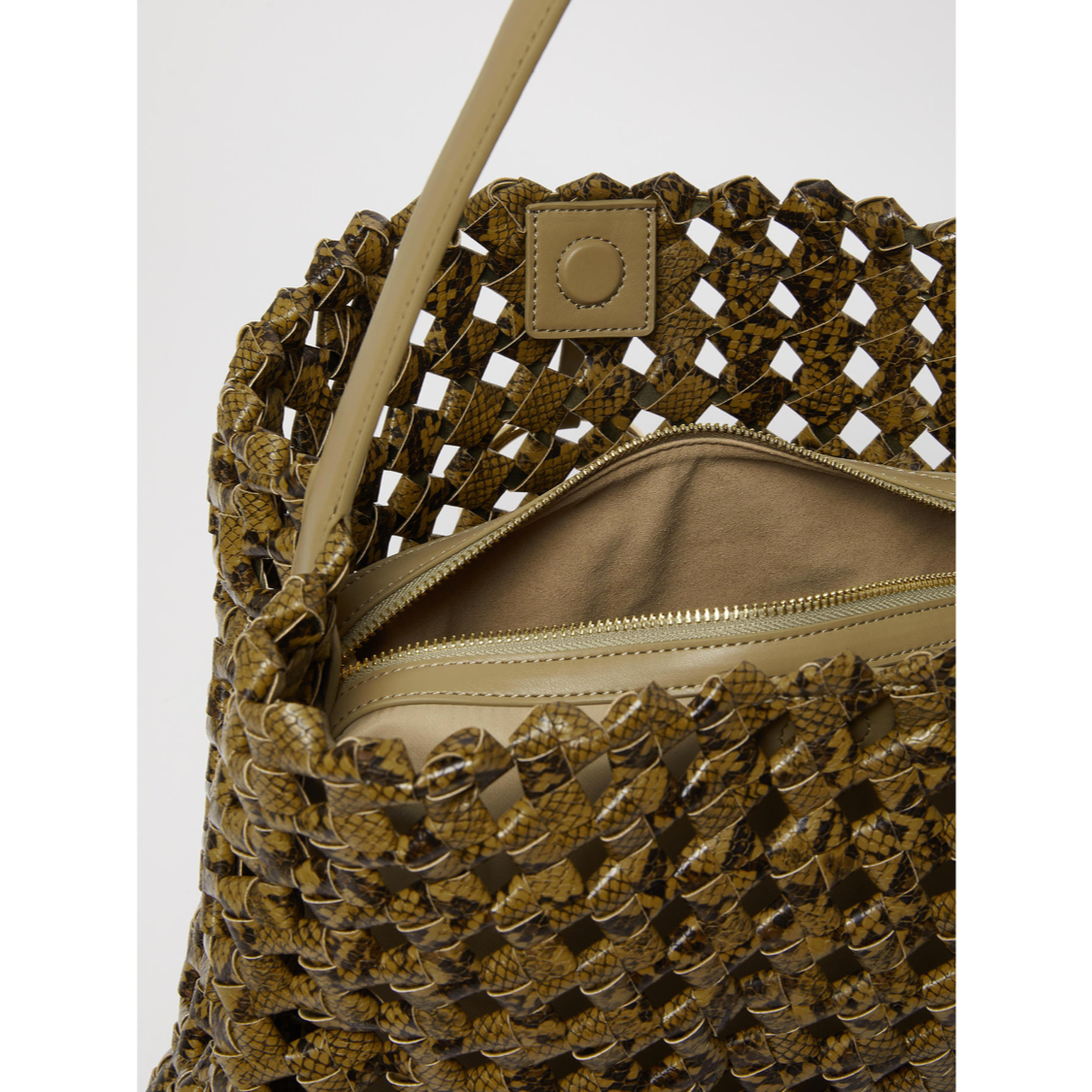 La stampa pitone regala un look ricco a questa borsa dal volume capiente. Sfoderata, gioca con la ricchezza della lavorazione intrecciata e con la perfetta organizzazione interna, grazie alla pouch zippata.