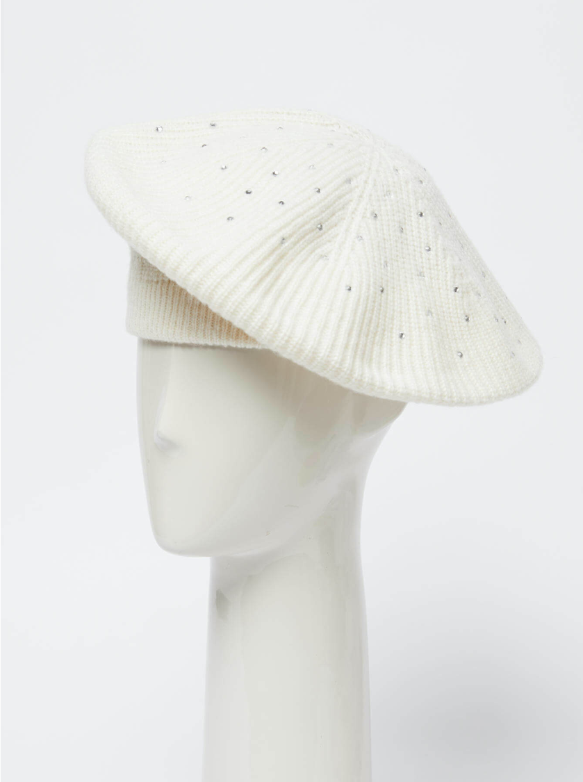 Basco in maglia di misto lana • Motivo di strass applicati • Bordo lavorato a costine.
