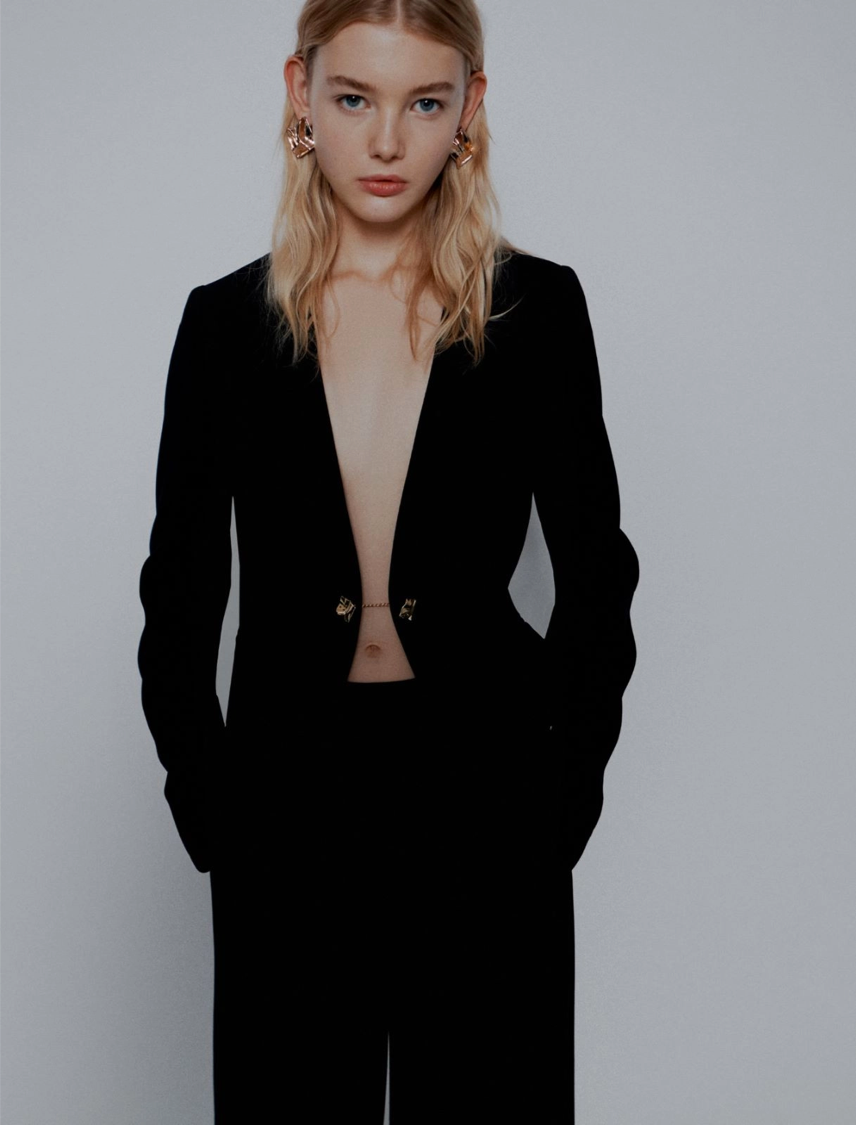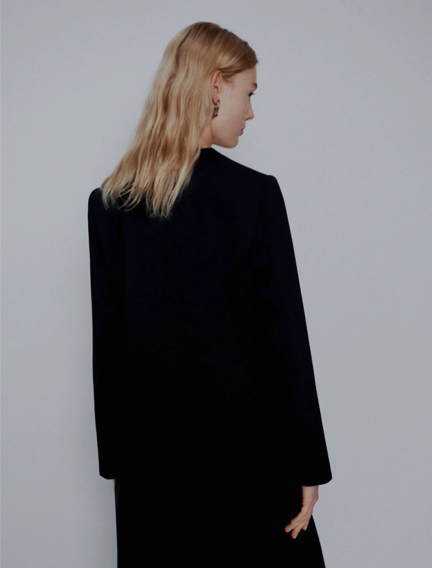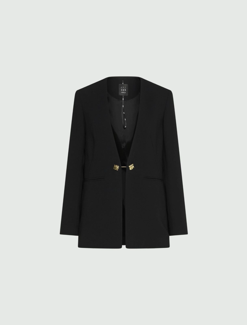 Interpretazione up to date del blazer monopetto, proposto in tessuto crêpe che scende fluido lungo la silhouette. Il taglio senza collo e la chiusura con gemello effetto bijoux svoltano il look, aggiungendo una nota sofisticata.