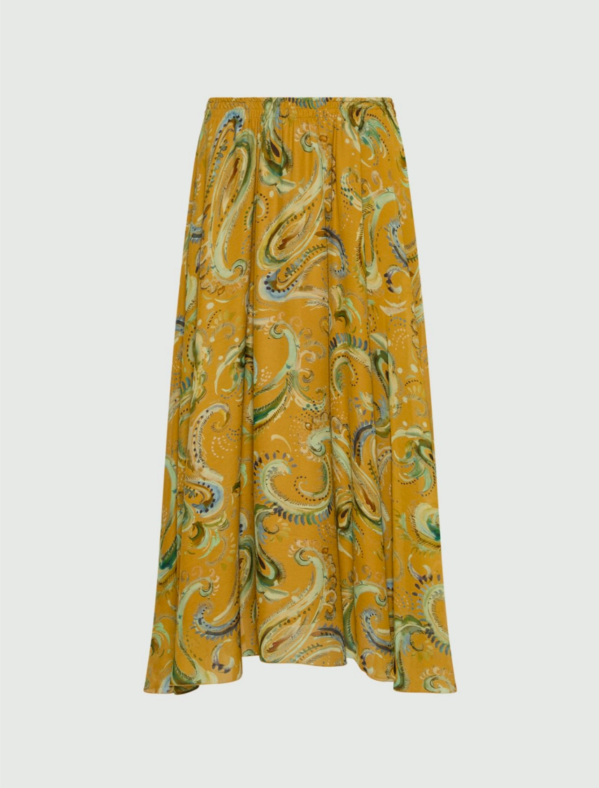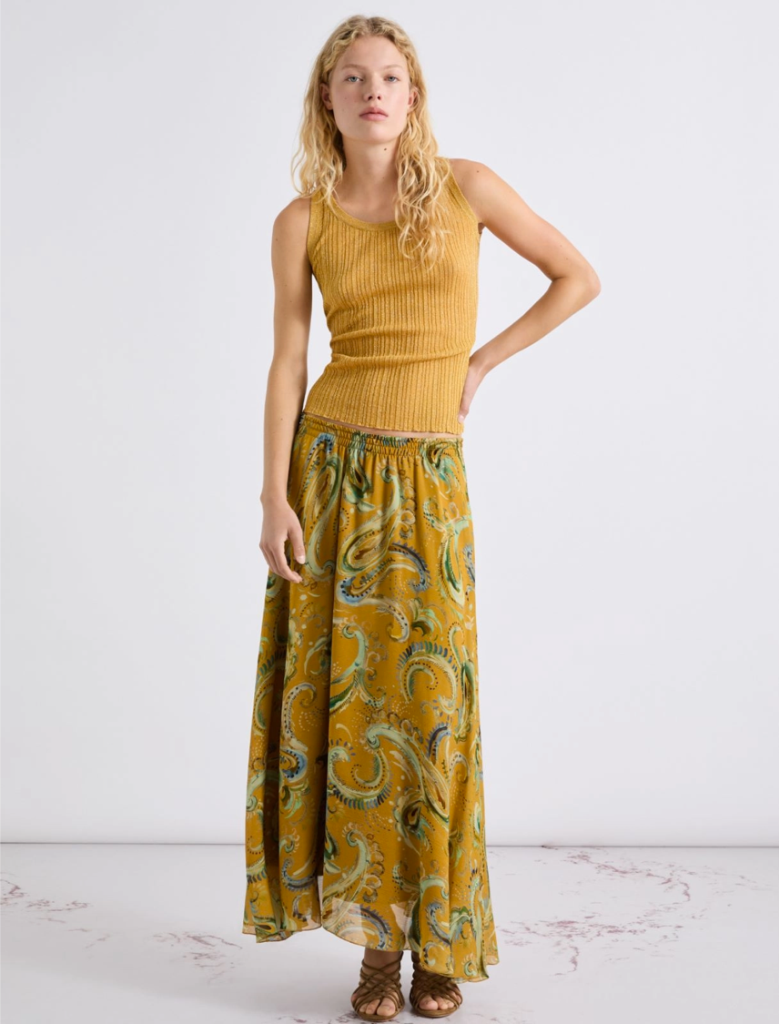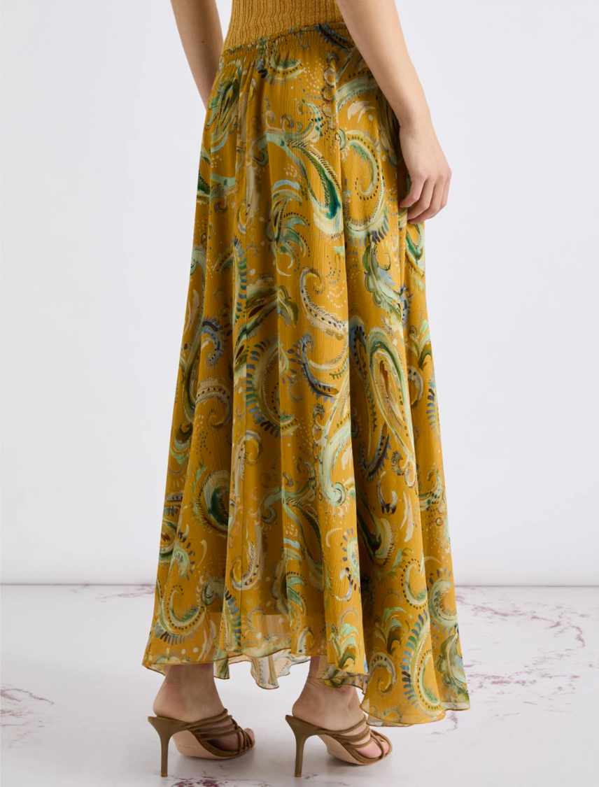 Una stampa multicolore e un creponne leggero definiscono questa nuova gonna, con linea svasata al fondo. Leggera, ti accompagna nella stagione calda con un’eleganza informale, perfetta per le giornate in città.