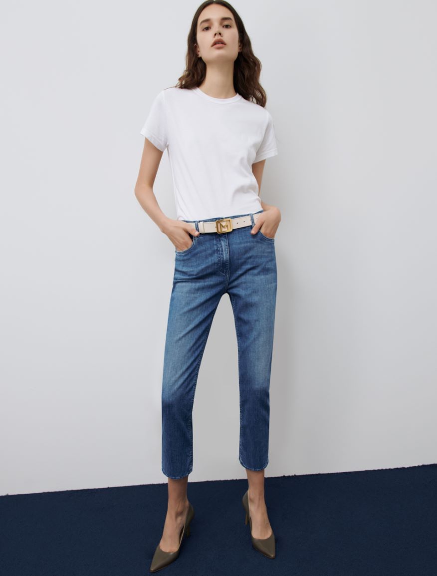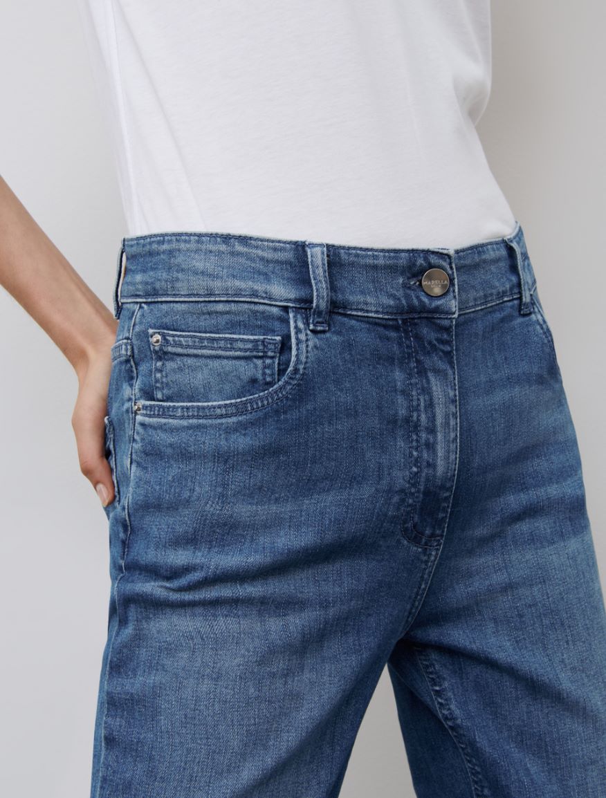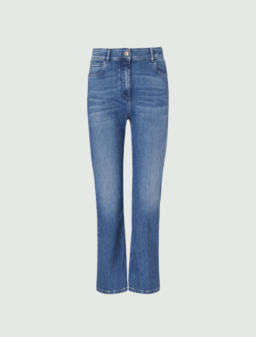 Jeans cinque tasche in denim di cotone stretch, linea flare cropped. Chiusura con bottone e zip nascosta. Piega stirata fronte e retro. Tessuto contenente cotone proveniente da una catena di fornitori impegnati in un’agricoltura a basso impatto ambientale.