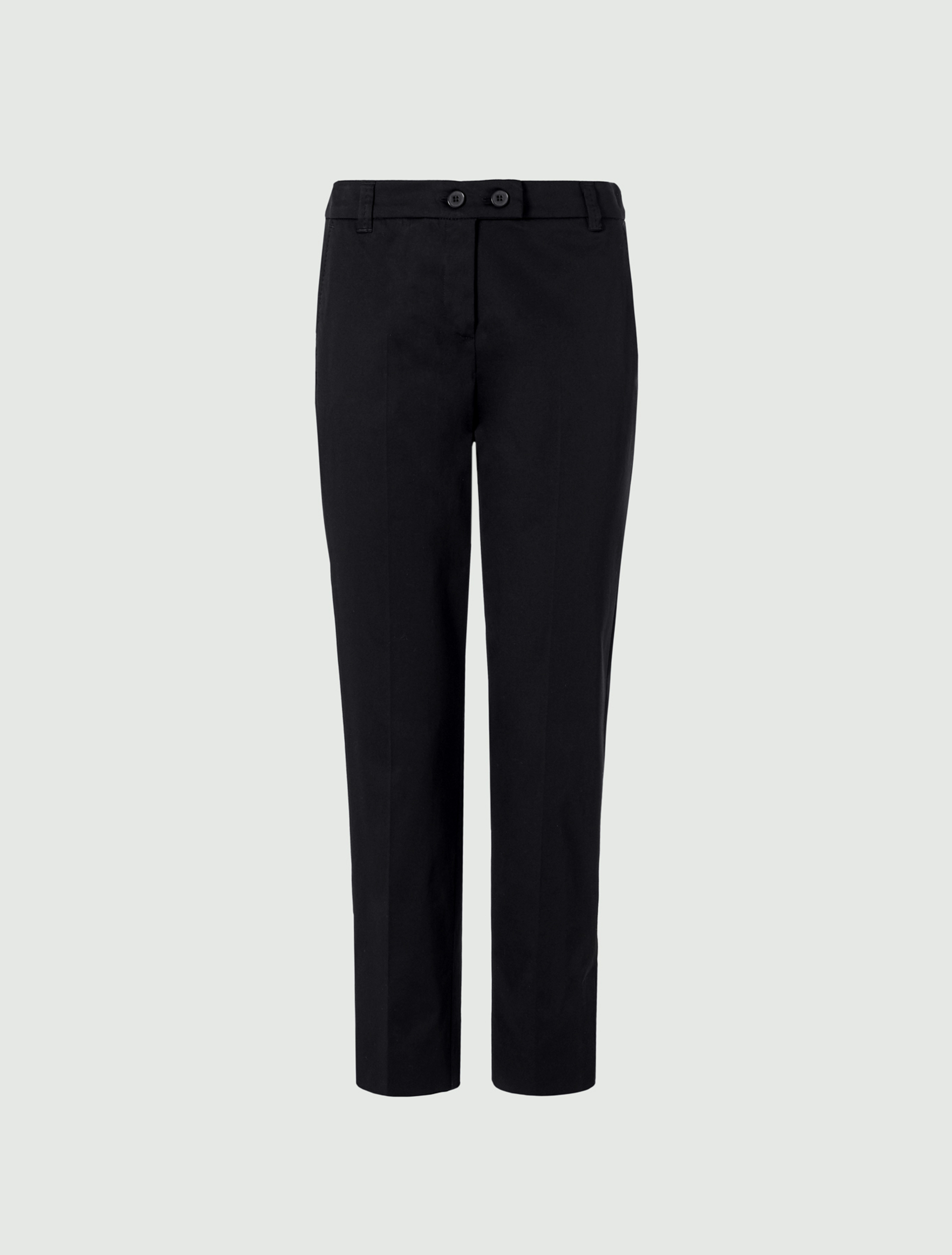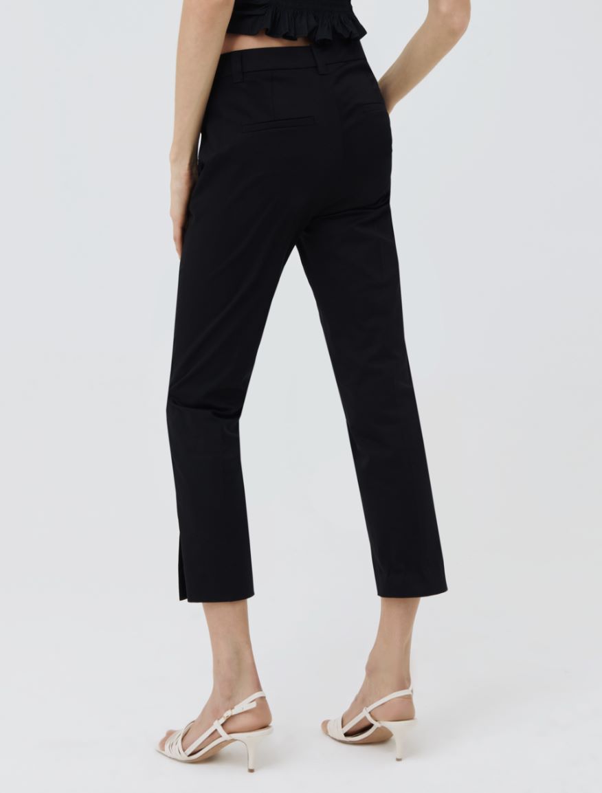 Pantaloni in raso leggero di cotone stretch, linea a sigaretta. Chiusura con bottoni e zip nascosta, tasche alla francese davanti, singola a filetto dietro. Spacchi laterali sul fondo. Piega stirata fronte e retro.