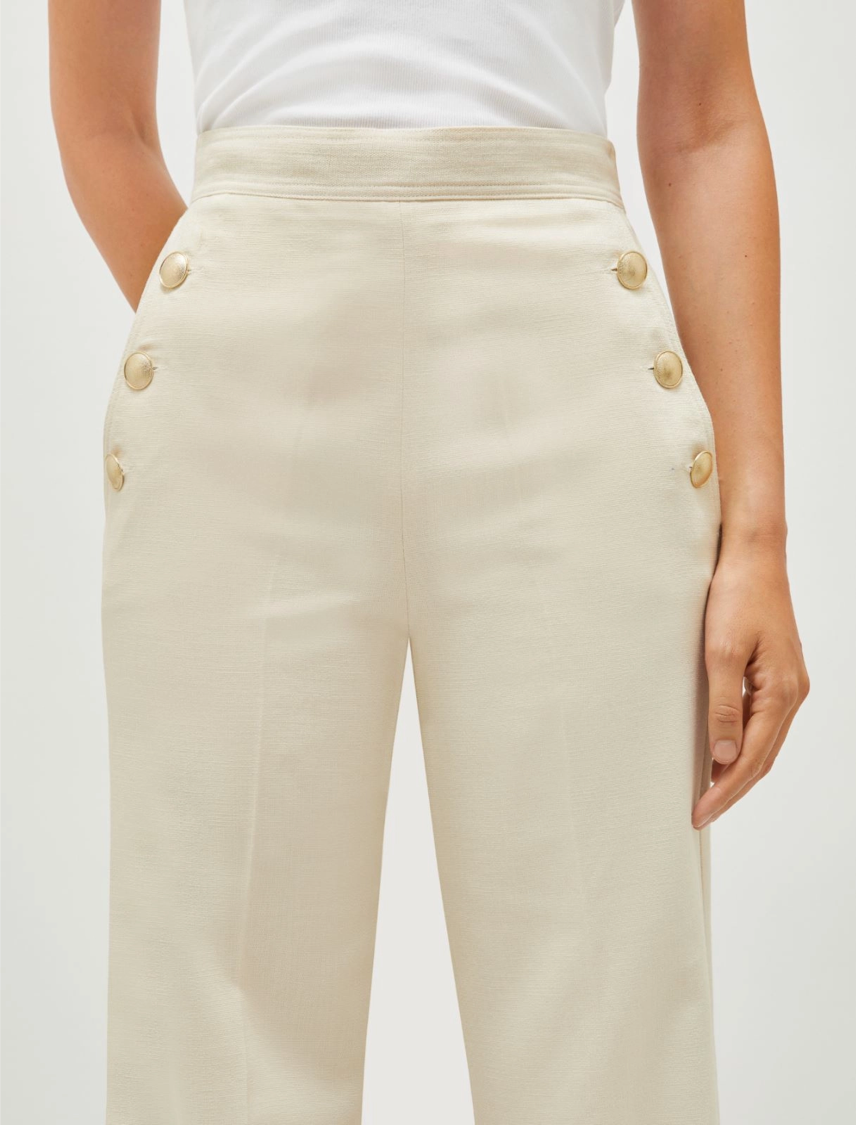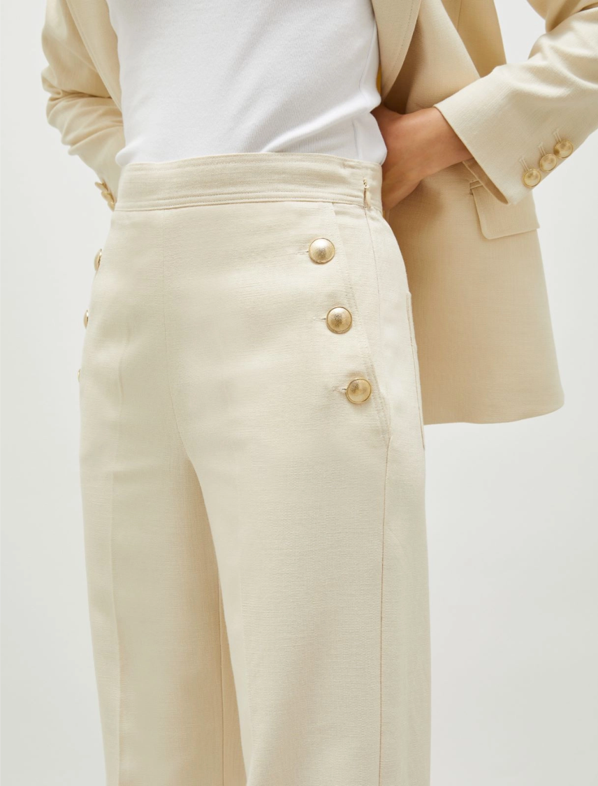 L’ispirazione marinara e la vita alta fanno di questo pantalone un pezzo versatile e dal carattere distintivo. I bottoni dorati aggiungono glamour. Provali by day con una t-shirt ricamata.