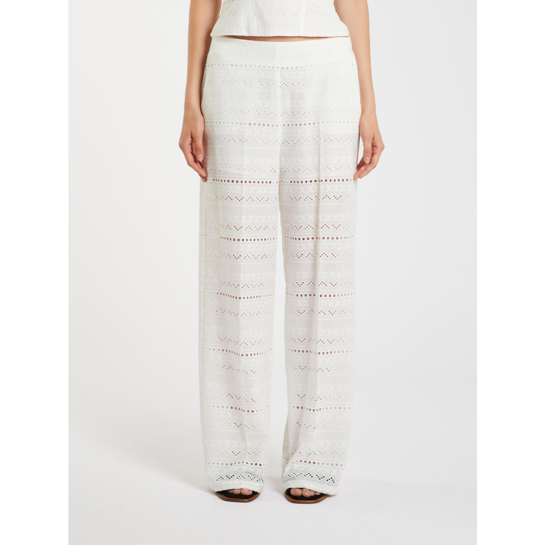 Scopri il fascino contemporaneo del ricamo: su questo pantalone straight leg si trasforma in dettaglio prezioso e semi trasparente, perfetto per le tue giornate estive. Abbinalo al bomber coordinato per un total look dalla sensualità up to date.