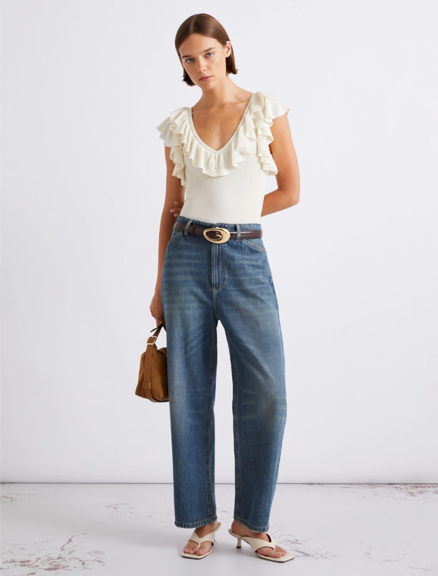 Top smanicato dall’allure super femminili, con un gioco di volant che mettono in primo piano lo scollo e le spalle. Aggiungi i denim e le ballerine per un outfit easy chic da replicare all’infinito.